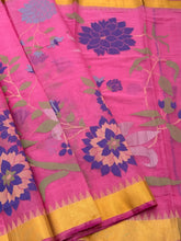 A gorgeous baby pink colour all over jaal weave organic handwoven ponduru Khadhi cotton Jamdani saree with florals and creepers all over the body woven in pink and green extra weft jaal jamdani weave with tissue zari temple border, and blouse plain