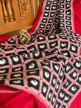A Masterpiece double ikkat Telia Rumal cotton saree with very traditional paisley motif inside checkered box double warped and weft tie dyed ikkat woven aesthetically in black red and white