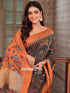 An understated piece of art in ponduru Khadhi cotton adorned with Handdrawn handpainted penkalamkari with floral creepers and Radhe Krishna pallu , silk woven borders , running blouse contrasted with saffron orange penkalamkari