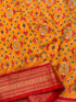 Yellowish orange with red kanchi jacquard weave zari border patola inspired navratan ikkat design on pure mulberry silk fabric
