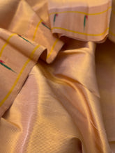 A stunner showstopper Handloom paithani tissue silk saree with single muniya border and stripes all over the body , having dual gold tone woven and a traditional paithani mor pallu