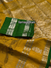 A lime yellow with green Natural Handmade Ecoprints Gadwal silk saree
