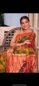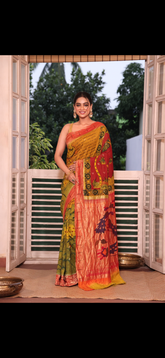 EXCLUSIVE HandDrawn And HandPainted Penkalamkari In pastel olive green Paithani Silk Saree