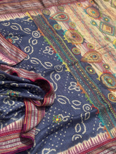 A fusion of meticulously handknotted and tie dyed Bhandej on different patterns on Karvati kinar vidharbha tussar silk SAREE , fusion again with mirror embroidery lambani threadwork tribal art which is aesthetically done using real mirrors