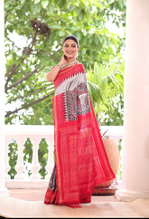 A stunner handpainted Madhubani folkart adorned on a premium pure mulberry silk ikkat saree in metallic grey shade